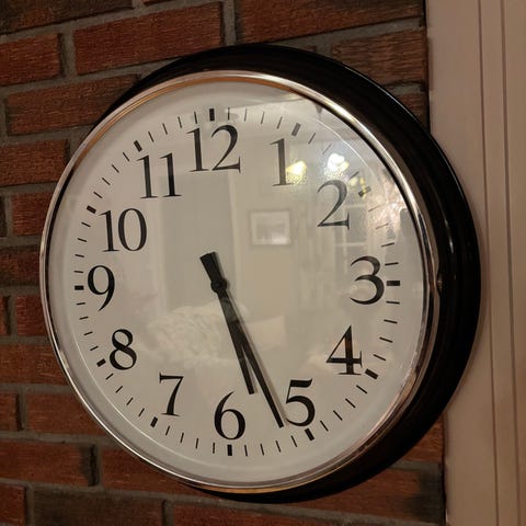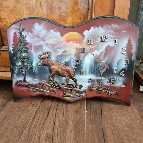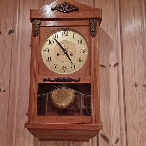 IKEA veggur med rektangulært design, vintage stil og romertall på urskiven. Klokken har en mørk ramme og en lys urskive med dekorative detaljer. Egnet for veggmontering i hjem eller kontor.