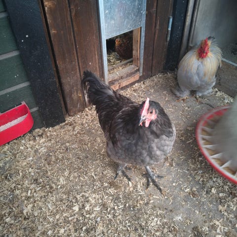 Tillitsfulle, koselige høner, som alltid kommer løpende når vi kommer.