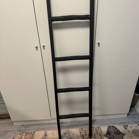 Dekoratativ i svartmale tre med flere trinn for oppheng av håndklær og pynt. Passer til bruk på bad eller andre rom for oppbevaring.