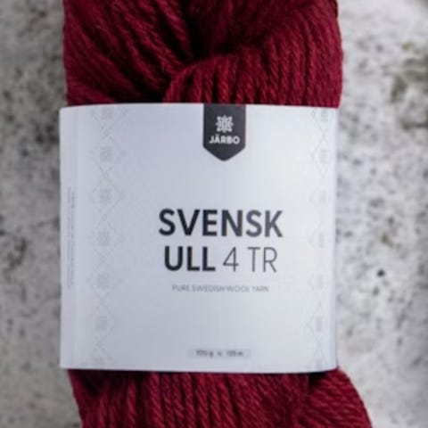 Fire farger: rød (164 g), burgunder (141 g), blå (120 g), orange (140 g). 100% ull, en-tråds.