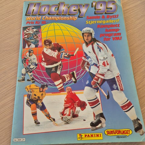 Hockey '95 World Championship samlekortalbum med bilder og informasjon fra ishockey-VM 1995. Inneholder komplett samling av spillere og lag, samt statistikk og kamphøydepunkter. Passer for samlere og ishockeyinteresserte.
