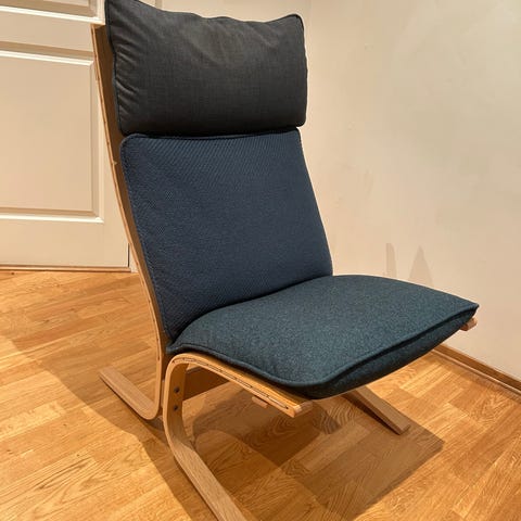 To nette lenestoler av den norske møbeldesigneren og interiørarkitekten Arnt Lande. Ypperlig hvis man har litt begrenset plass. Ikke synlig brukt. Ullstoff i spenstig eplegrønn farge. Nye fjører og stopping. Vippefunksjon. Buede skamler, den ene er litt skadet og må limes. For nærmere informasjon om hvor stolene er restaurert: https://www.instagram.com/sellamourfurniture/. Frakt innen Oslo kan tilbys.