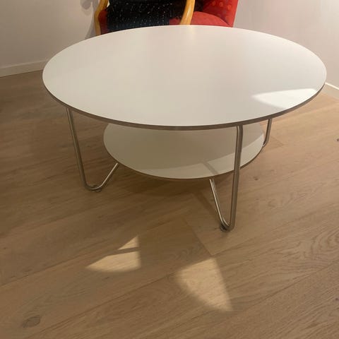 Rundt salongbord i eik med tre ben og enkelte bruksmerker. Ø 58cm.