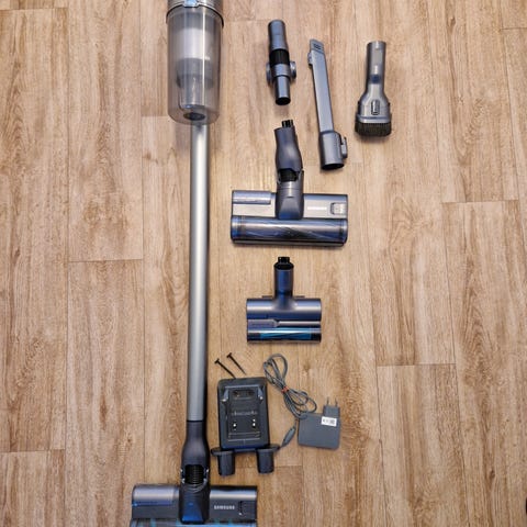 Deebot N8 robotstøvsuger i svart farge. Leveres med ladestasjon, ekstra mopper og bruksanvisninger. Designet for automatisert rengjøring av gulvflater med børster og moppfunksjon.