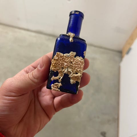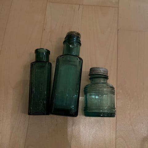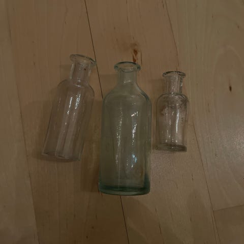 Et sett med ulike vintage glassflasker i forskjellige former og farger, inkludert brun, blå, klar og gulaktig glass. Flaskene varierer i størrelse og kan ha historisk eller dekorativ verdi. Samlet pris.