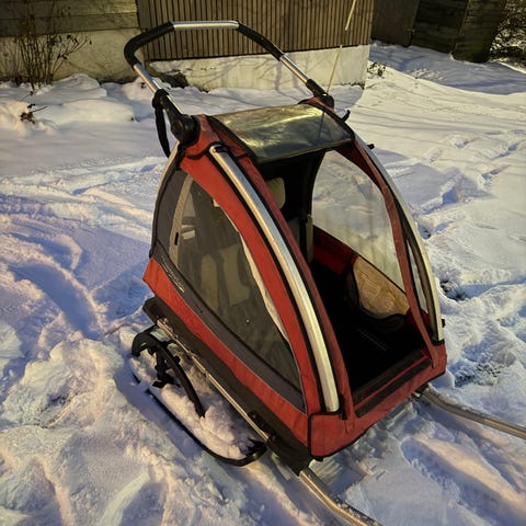 Et fint akebrett for småbarn 0-3 år med drasnor og pute for å sitte behagelig. Uten sikkerhetsbelte da det ikke var behov for oss.
