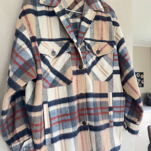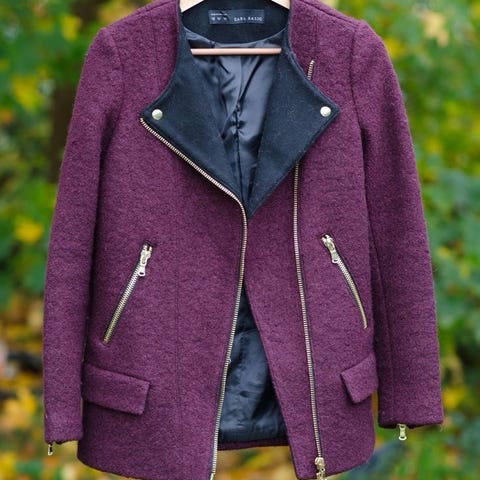 Zara ulljakke i størrelse S for kvinner. Jakken er grå og laget av ullmateriale. Den har glidelås foran og to lommer med glidelås. Jakken har en enkel og rett passform uten krage.