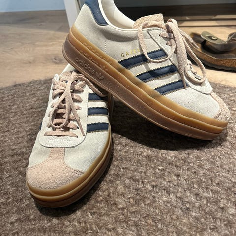 Adidas Gazelle sneakers joggesko i størrelse 42. Skoene er grønne med hvite detaljer og har en såle i gummi. Laget av semsket materiale. Passer for daglig bruk og fritidsaktiviteter.
