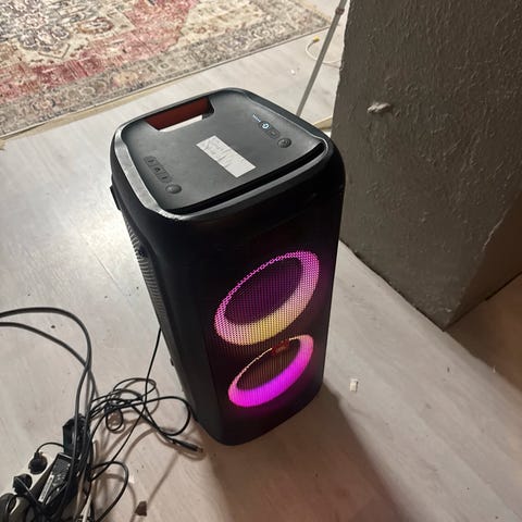 JBL Partybox høyttaler med integrerte lys for visuell effekt. Passer til bruk ved fester og arrangementer hvor lyd og lys spiller en rolle.