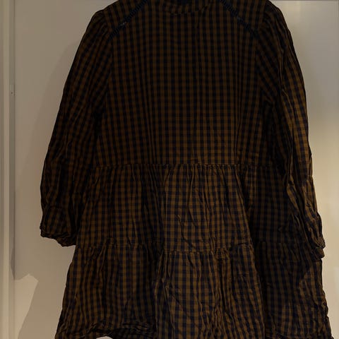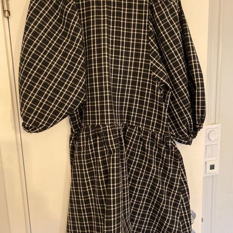 By Malina Andre kjoler i størrelse L for damer. Kjolen er svart med rutemønster. Den har lange ermer med rysjedetaljer og en løs passform med volanger nederst. Litt åpen rygg med knyting.