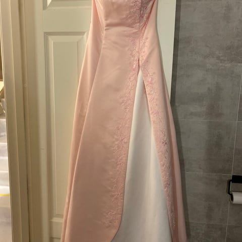 Ballkjole fra Aseed i str S. Lyserosa med sølvbroderi og små «krystallstener» på brystpartiet. Glidelås og snøring bak for justering.