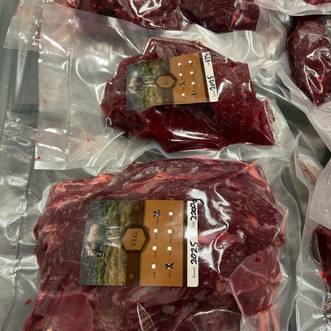 Vakumpakket elgkjøtt selges for 250kr kiloen. Selges i ca 10kg pakker med Suppekjøtt, Biff, Steik, og kjøttdeig.
