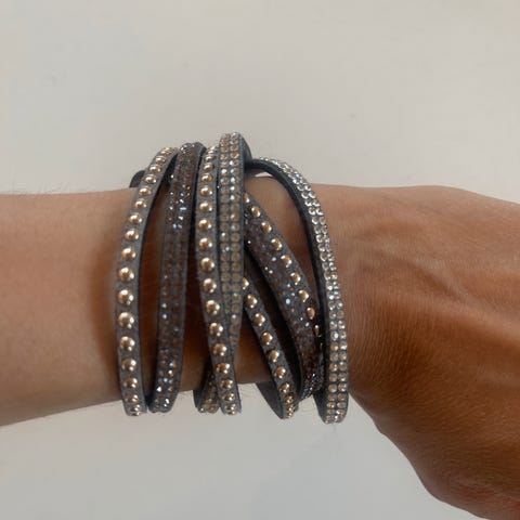 Sort skinnarmbånd med metall pynt.