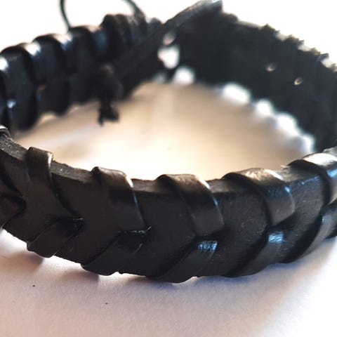 Sort skinnarmbånd med metall pynt. Armbåndet kan reguleres. Kan sendes. kan hentes.
