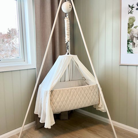 Pent brukt vugge med stativ inkludert originalt sengelaken og sengehimmel.