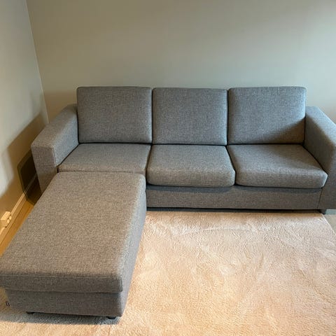 Grå 3-seters sofa. Veldig komfortabel. Putetrekk kan vaskes i maskin på maks 40 °C. Trekket er nylig vasket og er rent.