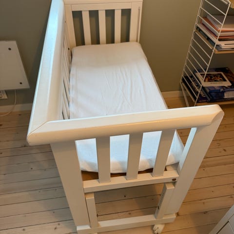 Troll Bedside crib barneseng i hvit. Kan justeres i høyden og hjulene kan låses. Sprinkelveggen mot voksensengen kan være både oppe og nede avhengig av hva man ønsker. Vi har vært veldig fornøyd med denne, men vår baby har nå vokst ut av den. Madrass kan medfølge hvis ønskelig!