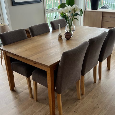 Selger et eikebord med 6 solide stoler i heltre. Bordet er 180X90,5 cm og hver klaff måler 45 cm. Altså mulighet for å gjøre bordet 270 cm langt.