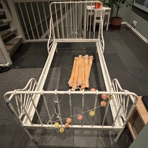 IKEA uttrekkbar seng designet for barn. Sengen har en metallramme med hvit finish. Uttrekkbar funksjon gjør det mulig å forlenge sengen ved behov. Passer for barn og kan tilpasses varierende lengder. Kan hentes på kampen i Oslo. Madrass medfølger som passer til lengde ca 8 år. Må hentes søndag!