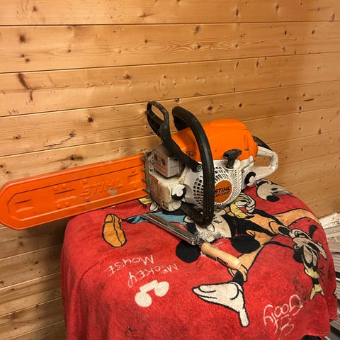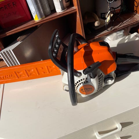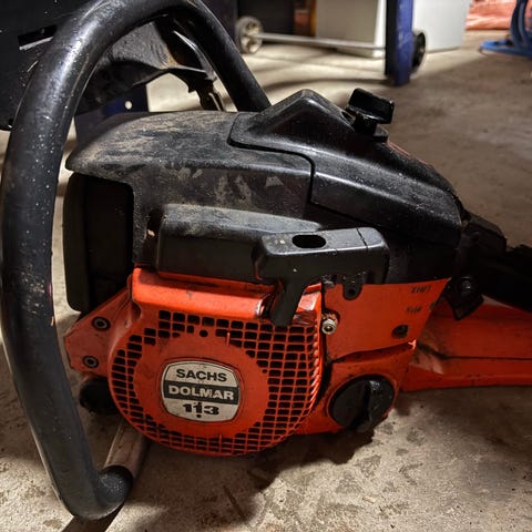 God gammel proff sag. Renovert med pasjon for disse sagene. Denne sagen har ikke kjedebrems. Dette kan monteres, men krever deler ifra en delesag som har brems. Disse kom uten og med brems. Jeg har bremse mekanismen, men mangler fremre handtak som har tilkobling til mekanismen i sverd/ clutch dekselet. En med erfaring velger kanskje å bruke en sag uten brems, slik mange måtte gjøre i gamle dager. Nybegynnere bør vel ha sag med brems sikkerhet. Sagen kan vel og være et samlerobjekt.