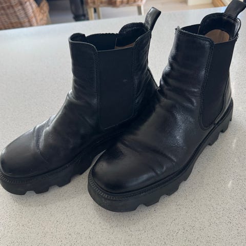 Stockholm Design Group Støvler i størrelse 40. Støvlene har en robust såle og elastiske sidepaneler, som gir enkel på- og avkledning. Laget i skinnmateriale, egnet for daglig bruk. Kun brukt en sesong så er mye sko og såle igjen!