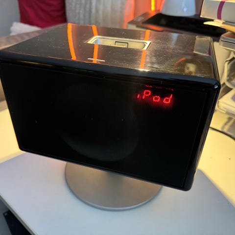 Radioen har klassisk design i børstet metall og to høyttalere med god lyd.