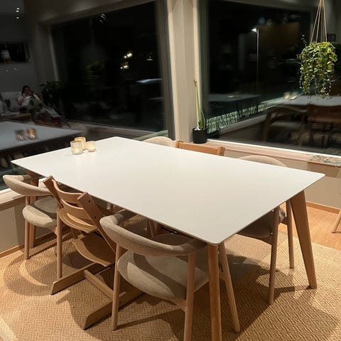 Century spisebord fra Skeidar. 200 x 100 cm. Det følger med 2 stk ileggsplater. Dette bordet tåler MYE og er perfekt for småbarnsfamilier! Til tross for mange år med tre barn ser dette bordet fortsatt fint ut, men selvfølgelig noen merker her og der.