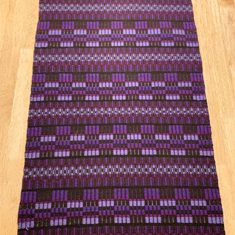 Håndvevd løper i ull til stort bord. God og avdempet fargekombinasjon; rustrød, okergul, svart og mosegrønn. Pent utført arbeid.