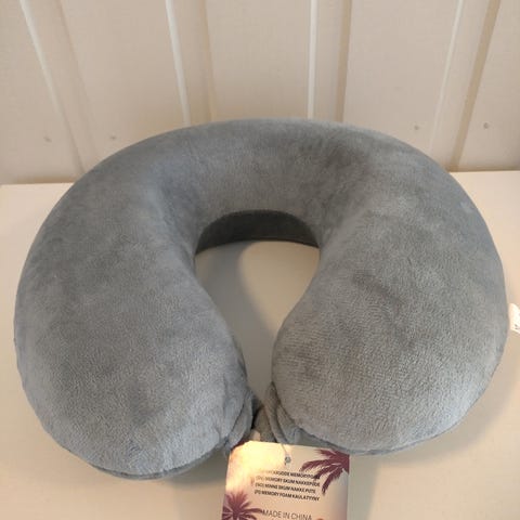 Nakkestøtte med grå tekstiltrekk og metallstativ til sofa. Den er ubrukt, og kjøpt på A- møbler.