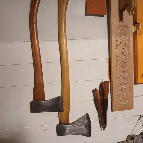 Ukjent buet redskap laget av tre. Lengde på ca. 60 cm. Bruk og formål er ikke spesifisert.