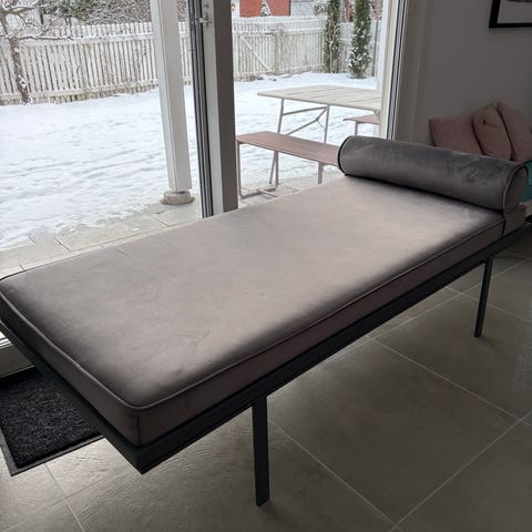 Veldig god å sove på, god fasthet. Den har en malingsflekk, men denne synes bare når sengen er rullet ut, og ikke sammenbrettet.