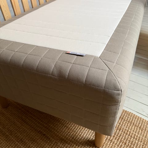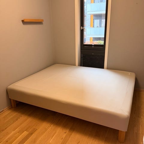 Seng bestående av to 80 x 200 cm SNARUM rammemadrasser fra IKEA, festet med festebeslag.