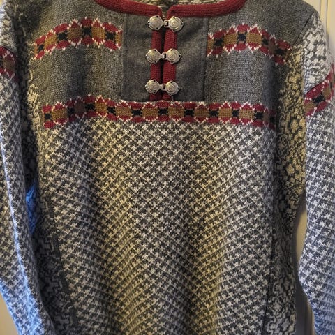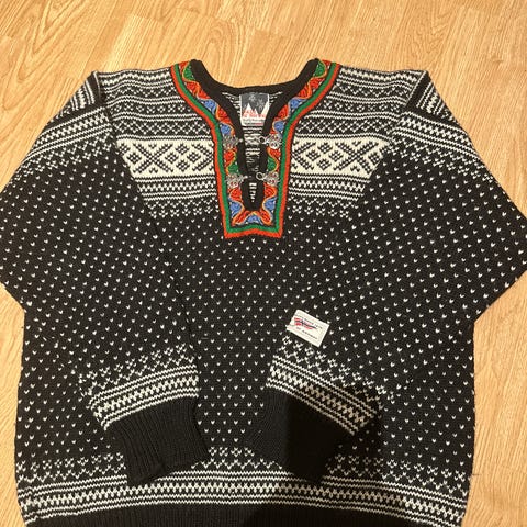 nydelig Dahle ull genser, størrelse M med flerfarget mønster. Laget av strikket materiale med tradisjonelt norsk design. Passer til hverdagsbruk og gir varme Str står det XL men er som en M