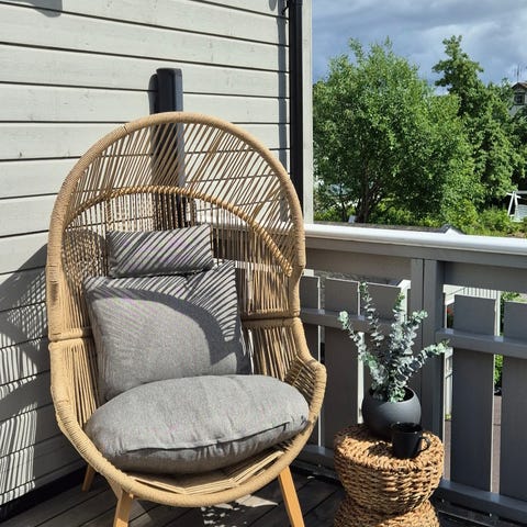 Kurvestol med rund form, laget av flettet materiale. Inkluderer sittepute og ryggpute i grå tekstil. Egnet for innendørs bruk.