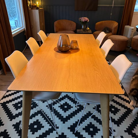 Bordet er bare brukt noen mnd før overgang til annet. Det ligger derfor nå i pappkartongen den kom i klar for nye eiere. Det hadde en liten stripe nederst på ene bordside (ser ut som et tynt hårstrå i str) da den kom fra butikken. Vi har ikke brydd oss noe om dette sa det er lite synlig og ikke sjenerende.