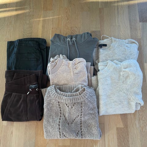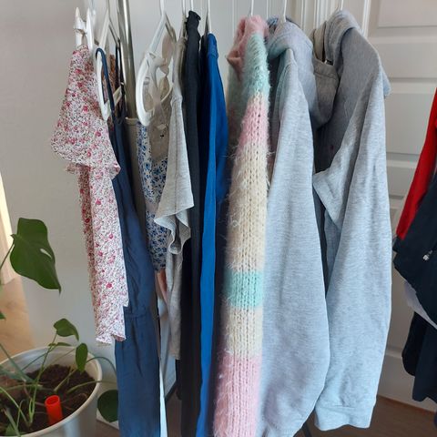 Klespakke til jenter str. S. Inkluderer ulike plagg som bukser, shorts, skjørt og bikini top med forskjellige farger og materialer.