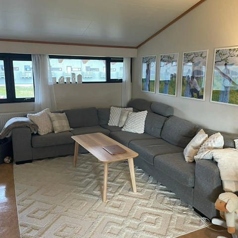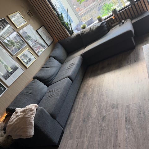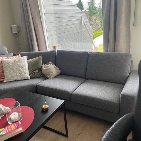 Selger en grå, romslig sofa kjøpt på Skeidar i 2020 da den blir for stor for rommene i nytt hus. Sittedybde er ca 50cm. Sittehøyde er ca 43cm. Langsiden av sofaen har stått inntil vindu og har fått fargeendringer pga av solen (se bilder). Dette synes ikke om den står inntil en vegg. Er en del småflekker - vi har ikke forsøkt å vaske dem vekk. Vil tro det meste forsvinner om man tar av og vasker trekkene. Sofaen er ellers i god stand, ingen ødelagt deler og alle putene godt inntakt.
