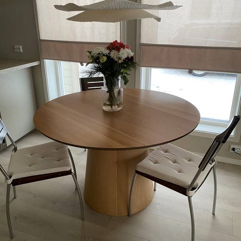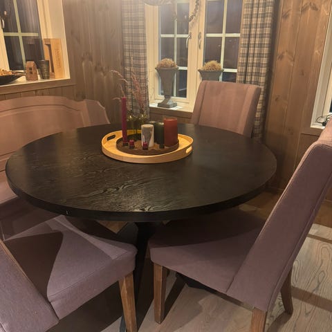 Feil kjøp, Bordet ser rundt ut på bilde , det er det ikke. så jeg selger et avlangt Bord fra Bohus med 4 stoler, det følger også med innleggsplate til bordet, alt er fint å se på.Bordet å stolene står på Fornebu.