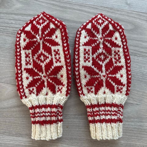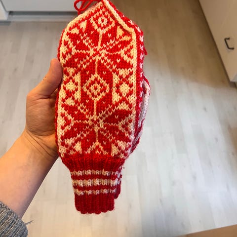 Håndstrikkede votter fra Kongsberg i blått og hvitt. Vottene er fulle av symboler fra kongsberghistorien, sølvverket: Sølv, 1624 og krone