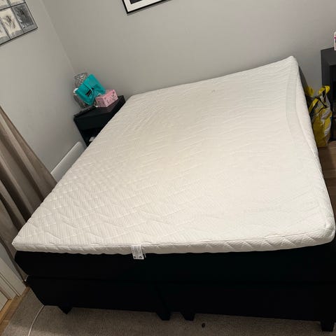 Dobbeltseng. Madrassene er godt brukte, men med en ny overmadrass vil sengen fortsatt være komfortabel. Det finnes noen flekker, derfor følger et beige bomullslaken med kappe med på kjøpet.