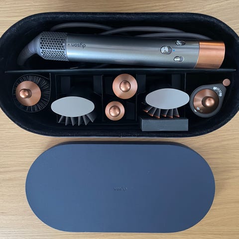 Dyson Airwrap hårstyler i blå og rosa farge. Inkluderer flere børste- og stylingtilbehør for ulike hårtyper og frisyrer. Designet for å style hår med luftstrøm uten ekstrem varme.