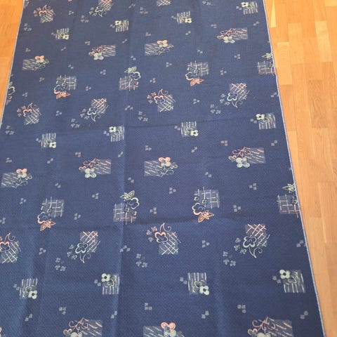Supersøtt jerseystoff med mønster av blomster i røde, rosa og grønne nyanser på svart bakgrunn. Bredde 150 cm, lengde 286 cm.