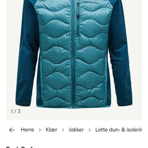 Dun og polyester-materiale. Farge mørk og lys blå. Egnet for helårsbruk, både som separat jakke og som mellomlagsjakke.