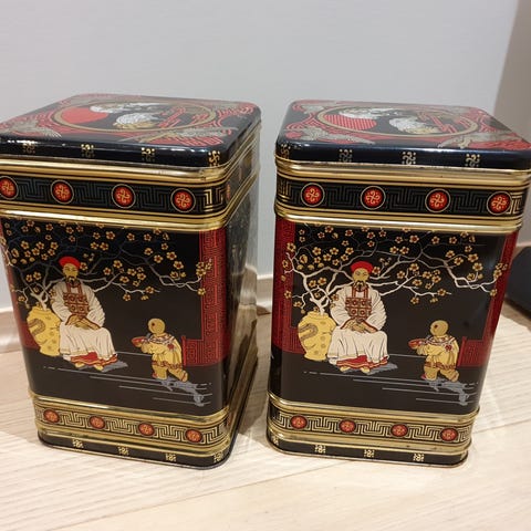 Asiatisk inspirerte metallbokser i sett på to med asiatisk-inspirert dekor. Boksene har samme størrelser, 25,5x16,5x16,5 og er dekorert med fargerike motiver av mennesker og dyr, samt tradisjonelle mønstre i rød, gull og sort.