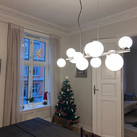 Diameter: 49 cm Lengde snor ca. 54 cm fra midten av kula Takfeste og oppheng følger med. Denne er tatt ned av elektriker.