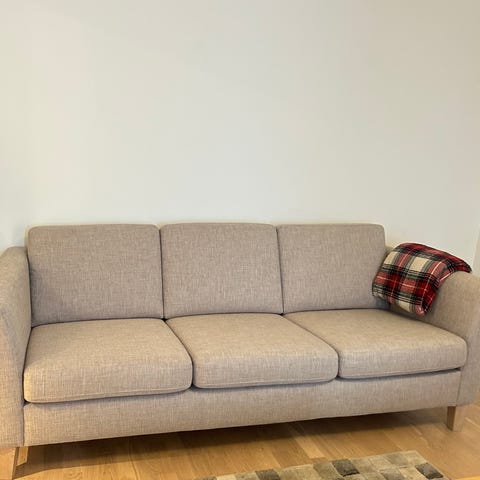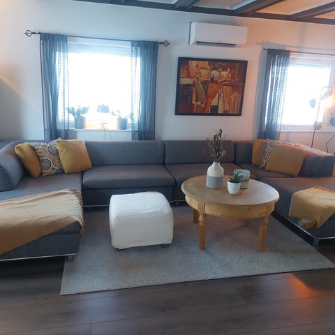 Deilig, mykt skinn og utrolig behagelig sofa å sitte i. Sittehøyde er 43 cm.