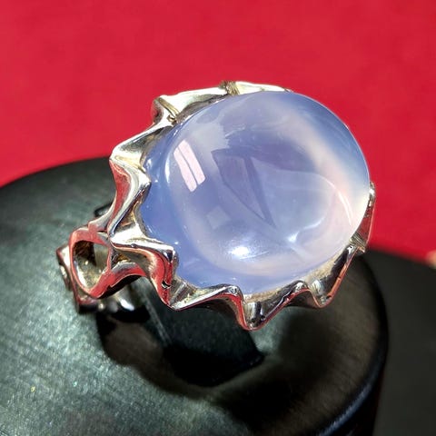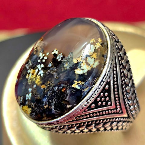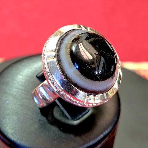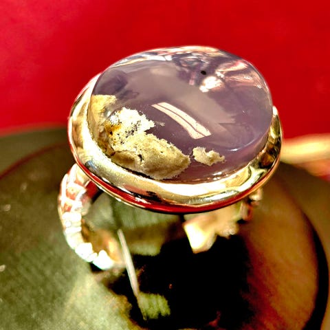 Vintage sølvring pyntet med en naturlig lilla agat på toppen med et vakkert mønster i flere lag i dybden.