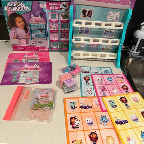 Pent brukte leker, gulvteppe og pute. Gabbys dollhouse bil med dukke og dansegulv.