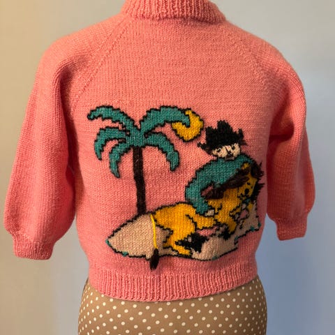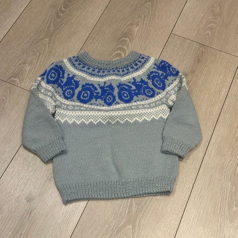 Helt ny hjemmestrikket genser i ullblanding i ulike farger rosa/lilla/grå/beige/naturhvit. Strikket med en ulltråd og en følgetråd. Raglandfelling.