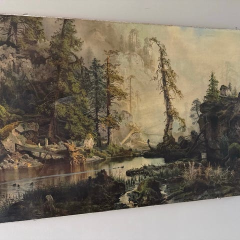 August Cappelens maleri «Svarttjern» (1852) i reproduksjon. Bildet er litt gulnet og har to små hakk. Hakkene er kun synlig når man står tett på bildet.